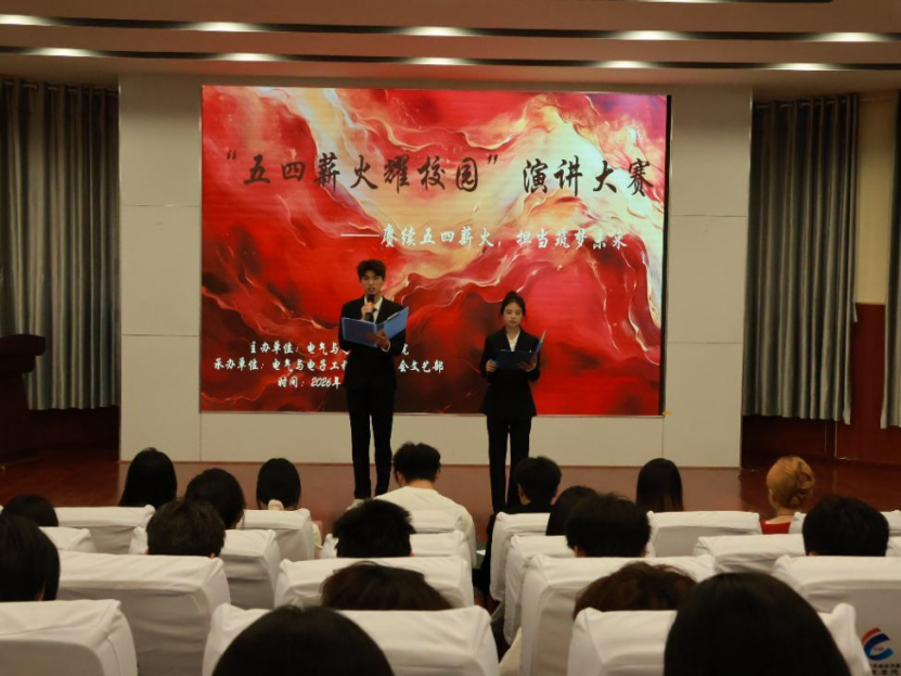 2026年4月26日晚19:00,电气与电子工程学院成功在萧秋厅举办“赓续五四薪火,担当筑梦未来”主题演讲比赛。活动由学院学生会牟佳林、何一鸣担任主持,邀请了250余名学生到场参加。